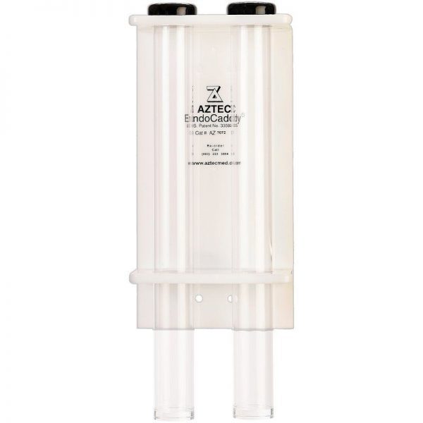 EndoCaddy®  AZ7072, double tube holder for soaking, storing or drying flexible Hysteroscopes.  Includes two clear polymer tubes 20″ long x 2″ diameter, vapor lids, bracket and mounting bolts