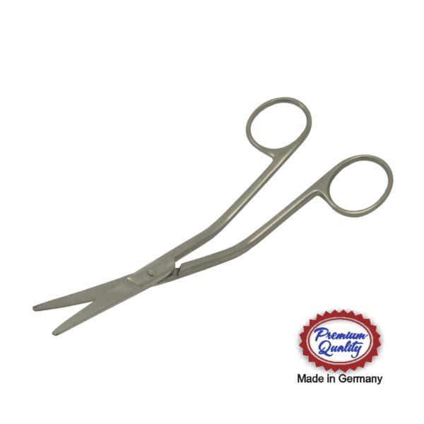 Goldman Septum Scissors with straight serrated blades and angled handle shaft, overall length 5.5″, compared to Storz N5056, Premium German Stainless Steel